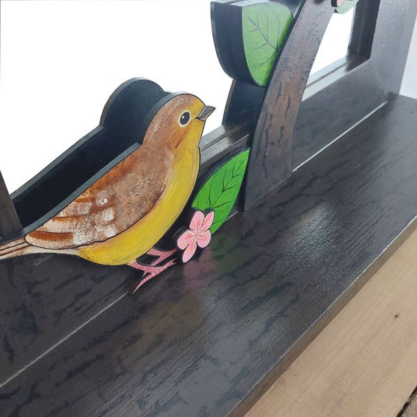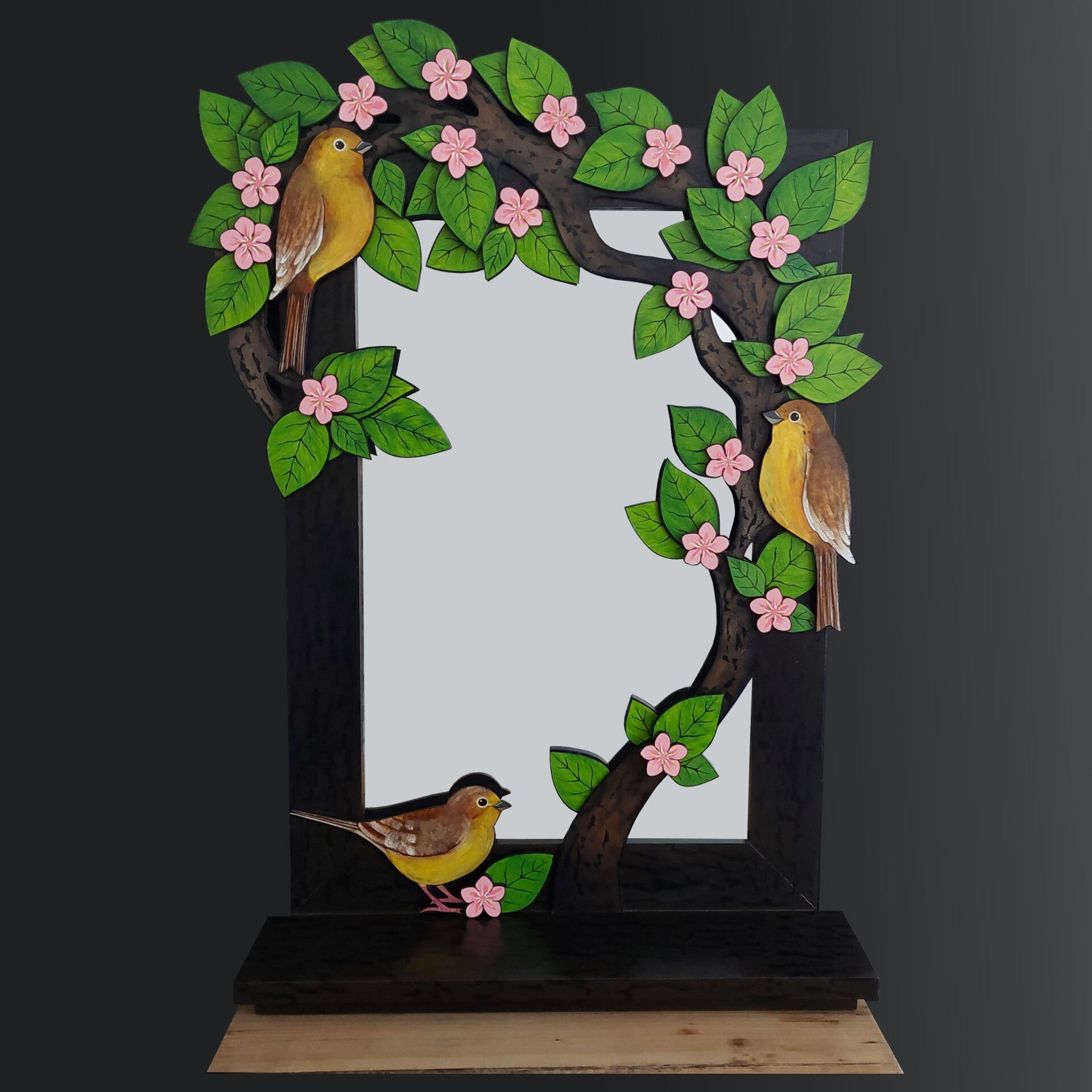 Deze spiegel met roze bloesem en gele vogels is handbeschilderd, gemaakt van geupcyclede en nieuwe materialen en uniek in de zin dat er maar één exemplaar van ontworpen en gemaakt is.